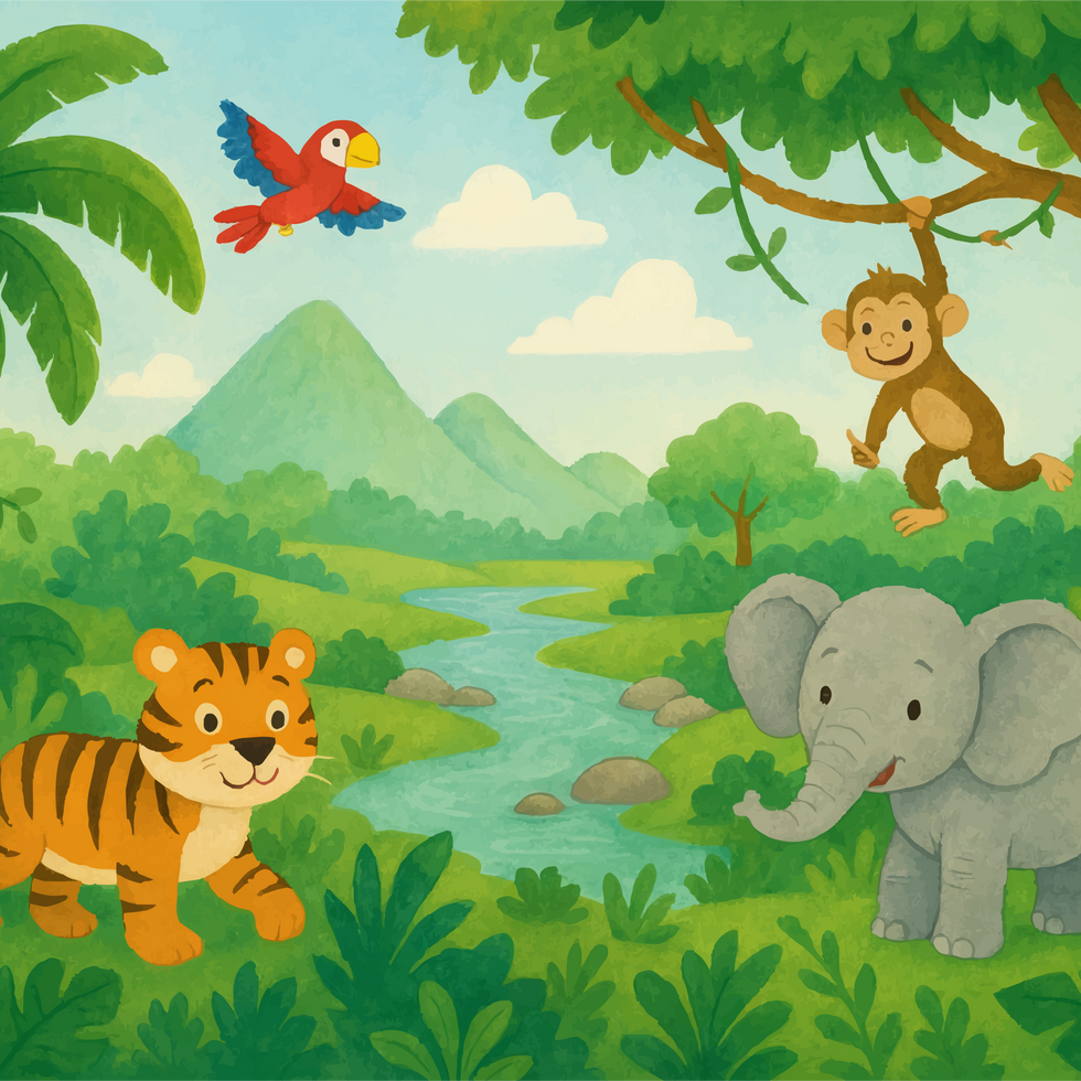 A fun and friendly jungle mural featuring a playful monkey, curious tiger cub, gentle elephant, and colourful parrot set within a lush green jungle landscape. Soft illustrated shapes and calming natural tones create a cheerful yet relaxing scene, perfect for nurseries, bedrooms, and play spaces.
