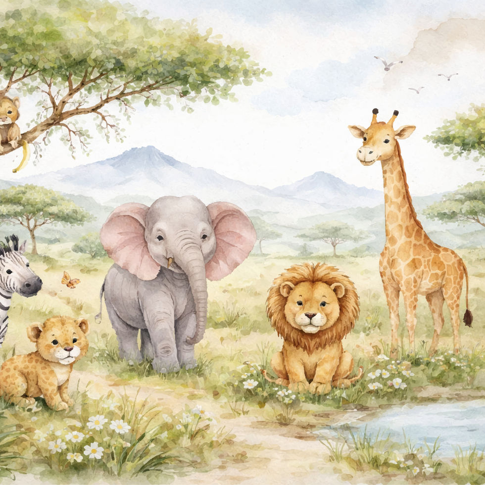 A soft watercolour safari mural bringing gentle savannah wildlife into your child’s space.