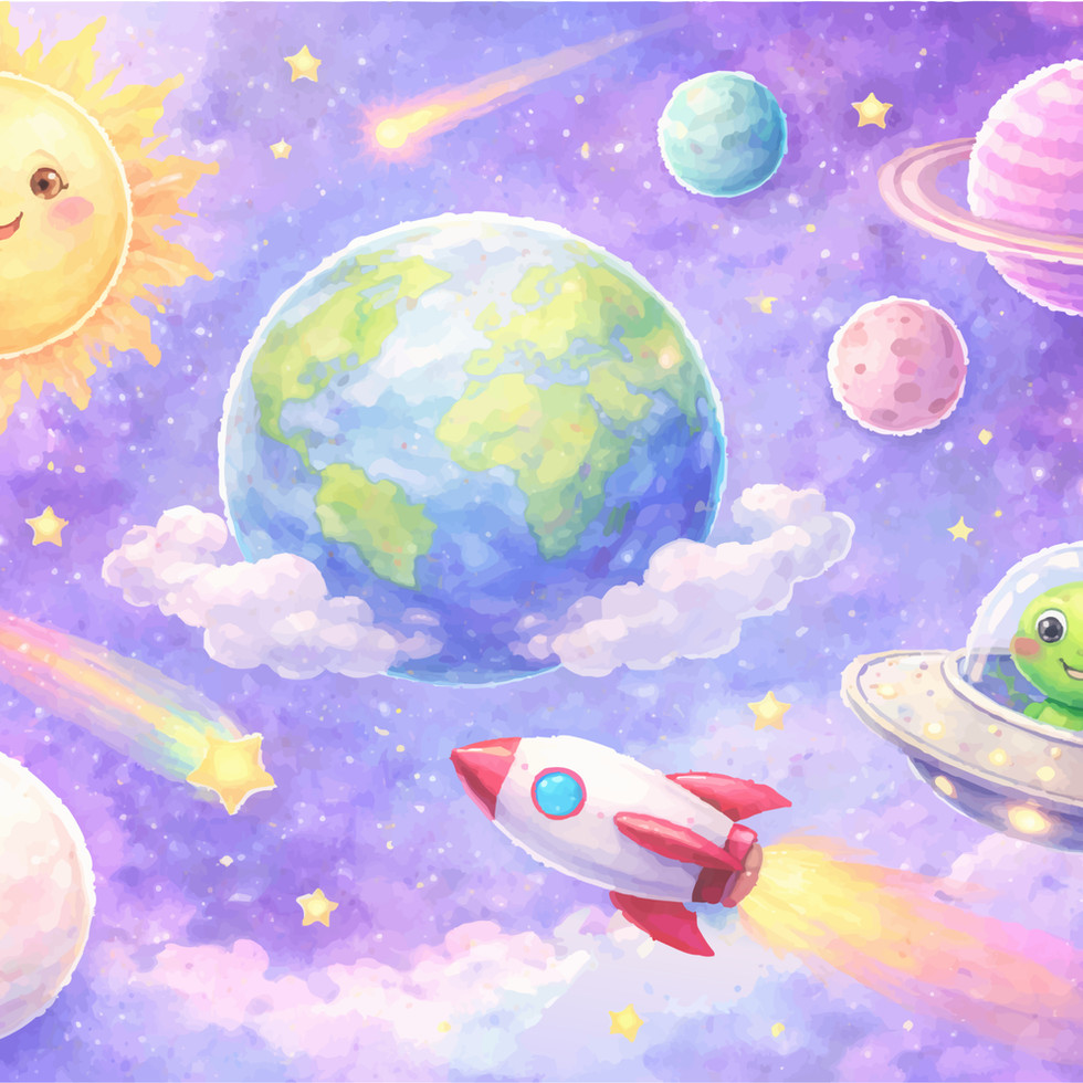 A soft, playful space mural featuring smiling planets, shooting stars, a cheerful rocket, and a cute alien in a flying saucer. Gentle pastel colours and dreamy watercolour textures create a calm, magical scene that’s perfect for nurseries, bedrooms, and play spaces.